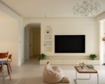 Lowboard mit Diffusionsrückwand: Hinter dem TV absorbieren 3D-Reliefs Erstreflexionen, Hohlkammern speichern Wärme tagsüber und geben sie abends ab. Kabelkanäle bleiben unsichtbar.